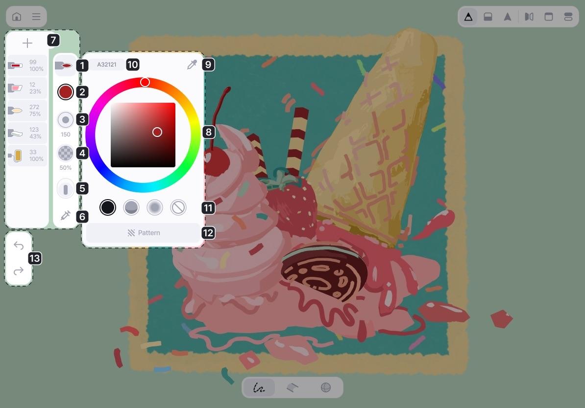 Tap and hold the active color icon in the brush panel, then drag up, down, left, or right to adjust the current color's saturation and brightness. Drag left or right to adjust saturation and up or down to adjust brightness. This gesture is useful for making subtle color changes while drawing.