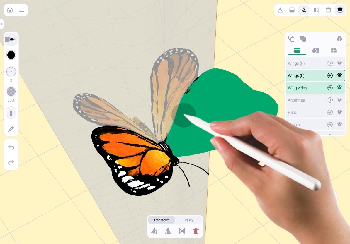 Tap Select in the tool menu, then drag with your pen to select. Selected curves are highlighted in green. If you're using Apple Pencil Pro, you'll feel a gentle haptic feedback whenever a curve is selected. After selecting, you can duplicate, transform, import to a group, and more.